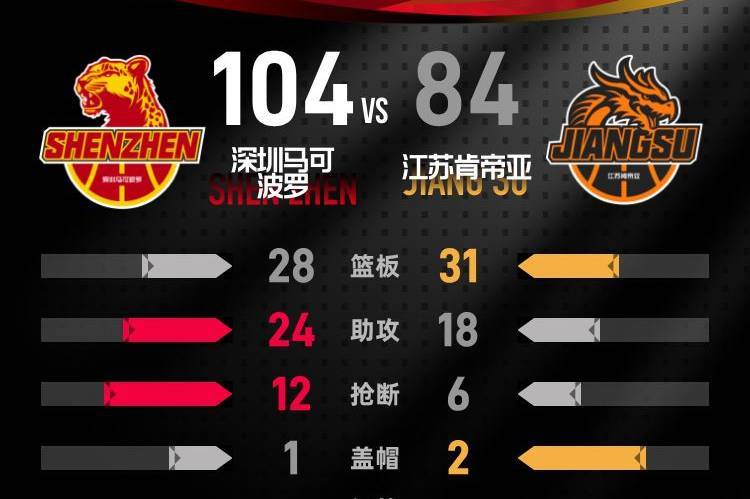 进入第四节比赛,贺希宁抛投得分打开局面,蒋浩然、斯塔克斯连续得分缩小分差,周鹏命中三分稳住优势。之后双方你来我往,分差始终维持在10分以上。贺希宁命中三分后,史密斯连拿5分,其中包括一记三分,分差重新回到20分。王浩然接周鹏助攻命中三分,分差扩大到21分,江苏队换下全部主力,比赛进入垃圾时间。终场前容子峰命中三分,贾尔斯最后跳投得分,最终深圳马可波罗以104-84击败江苏肯帝亚。